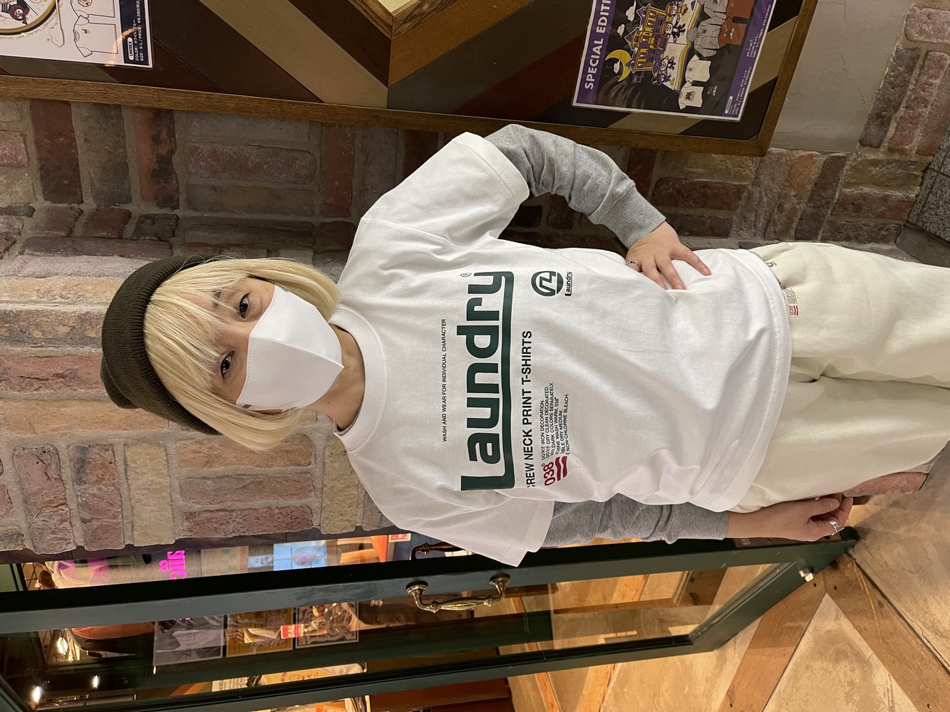 淡いカラーのワントーンコーデも、ロゴのグリーンと小物の色を合わせるとピリッと引き締まります!