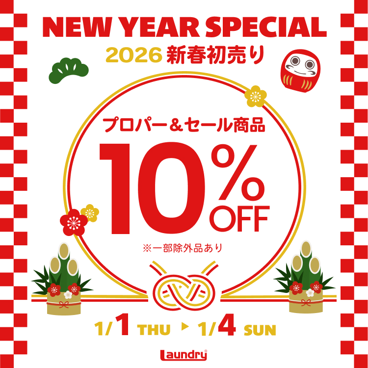 NEWSニュース INFO 2025.12.30 \セール品も対象!/10%OFF!「NEW YEAR SPECIAL 2026」を1月1日(木)より開催! Laundryでは、2026年1月1日(木)より新年の特別イベントとして、 期間中、セール品を含め10%OFFとなるキャンペーンを実施します。(※一部除外品あり) おトクなこの機会に、ぜひお買い物をお楽しみください。 開催期間 2026年1月1日(木)0:00~1月4日(日)23:59 開催店舗 店舗/オンラインストア 対象アイテムを見る>> NEXT. \MAX60%OFF!/「WINTER SALE」を12月26日(金)より開催! PREV. 1月16日(金)~1月29日(木)公式アプリまたはオンラインストアへの新規会員登録で1,000ポイントプレゼント! 一覧に戻る